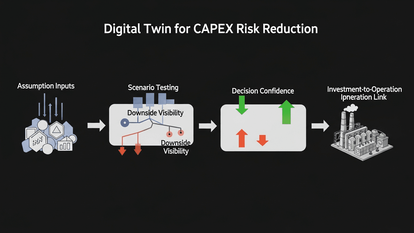 Digital twin reduces CAPEX risk by moving uncertainty forward into a controlled decision stage. That beats discovering weakness after approval, when redesign and delay are far more expensive.
