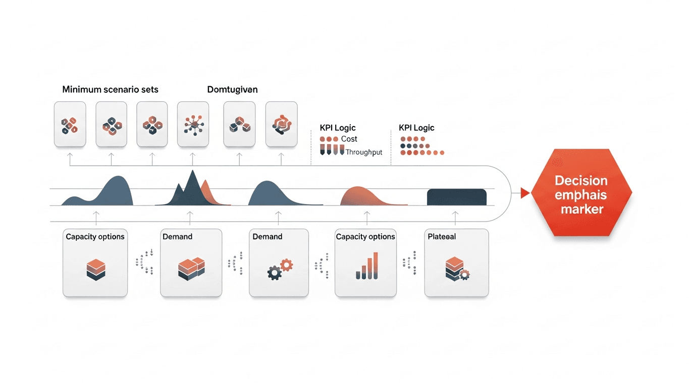 Lock the decision sentence and real alternatives. Define baseline using recent weeks that include pain, not only smooth weeks. Encode constraints that matter: staffing rules, tool sharing, material release, transport loops. Run the scenario set with the same randomness or trace-replay policy across alternatives. Compare trade-offs in plain language—cost, risk, flexibility, time to implement—and record assumptions that would invalidate the conclusion if wrong.