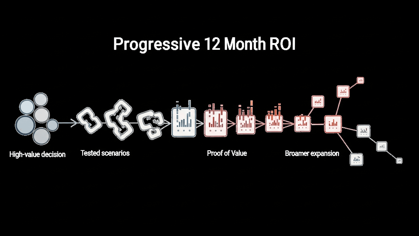 A twelve-month ROI path typically looks like this: start with one high-value decision, use manual or historical inputs where enough, test scenarios that affect cost, throughput, or risk, prove value, then expand. Economic credibility does not require a giant first leap.