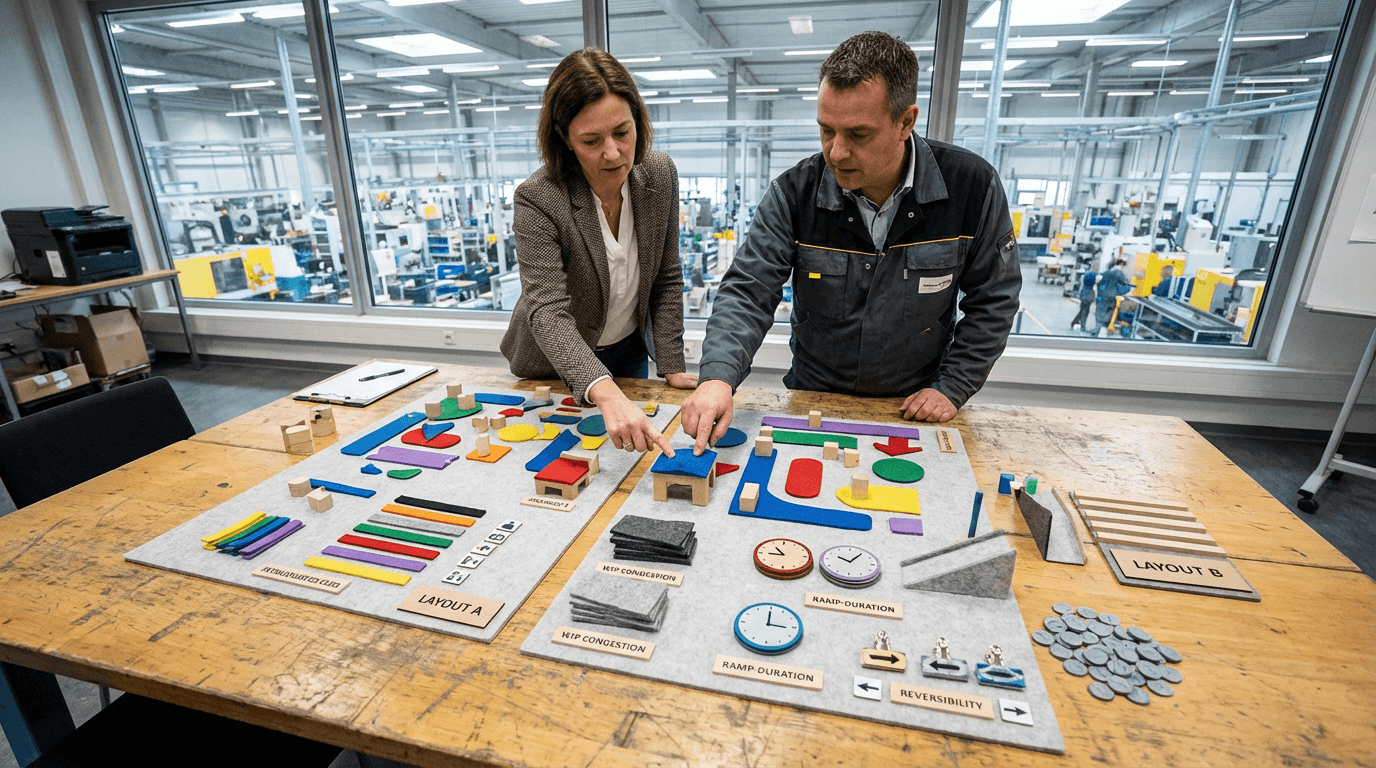 Constraint behavior under stress: where time accumulates when demand swings and suppliers slip. Intralogistics load: meters, touches, and handoff queues tied to the new footprint. WIP and congestion: floor space for buffers versus policies you will actually run. Mix and changeover sensitivity: whether the smooth-week winner loses in a volatile month. Ramp and stabilization: weeks to reliable rate with credible learning and quality curves. Cash and working capital: inventory and WIP timing—not only capex ticket price. Reversibility and modularity: cost to undo a wrong bet in a confined site.